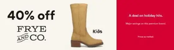 Hurry in and take 40% off on FRYE and Co. shoes in store for a limited time.