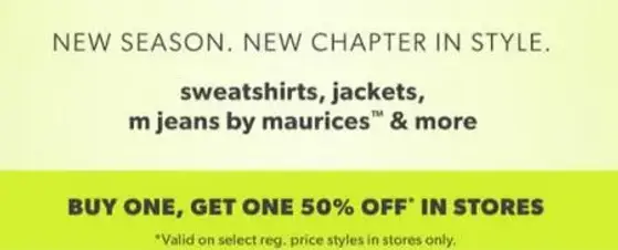 Hurry! Shop in store and enjoy buy one, get one 50% off sweatshirts, jackets, m jeans by maurices™ & more.