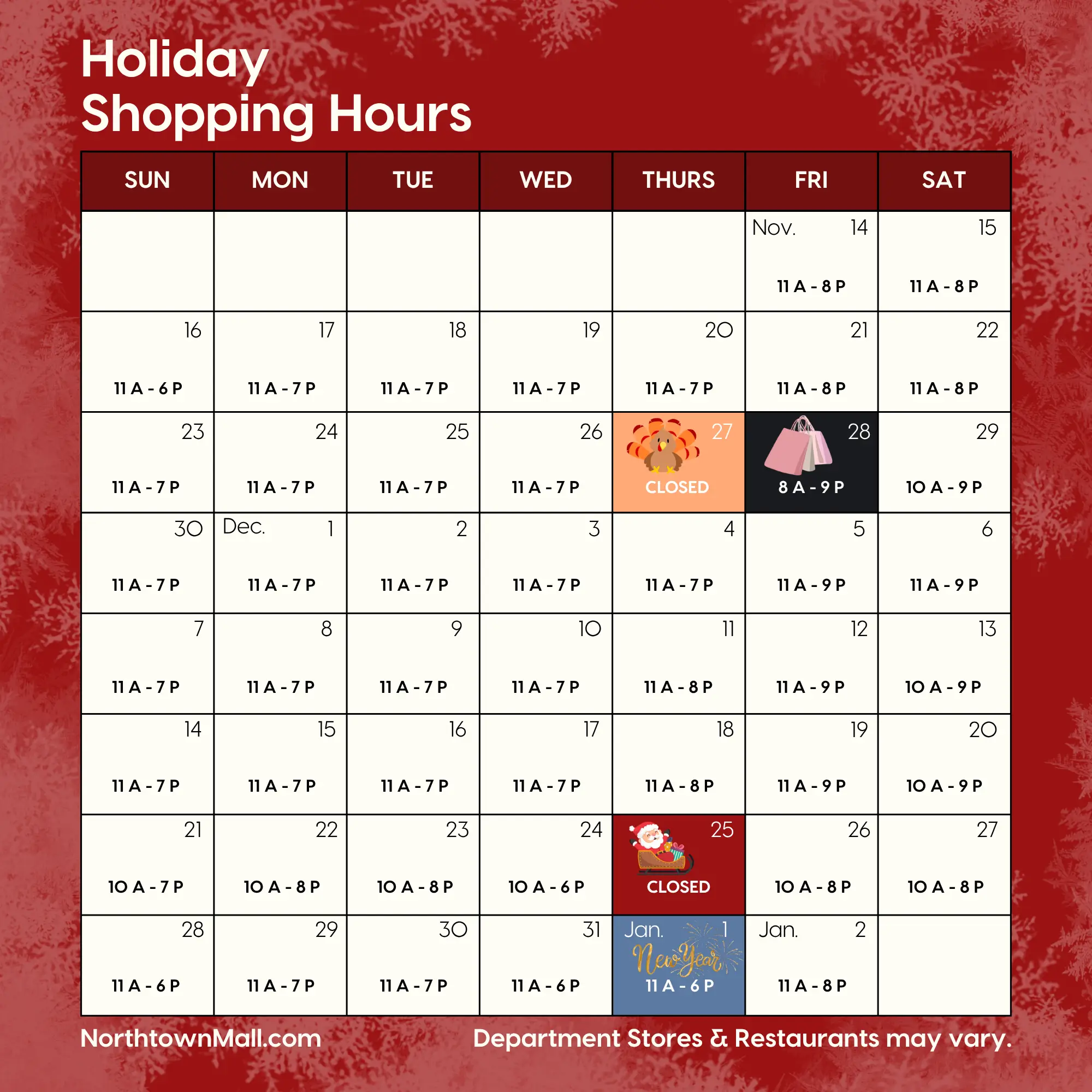 11:00 AM - 08:00 PM - Anchor stores & restaurant hours may vary